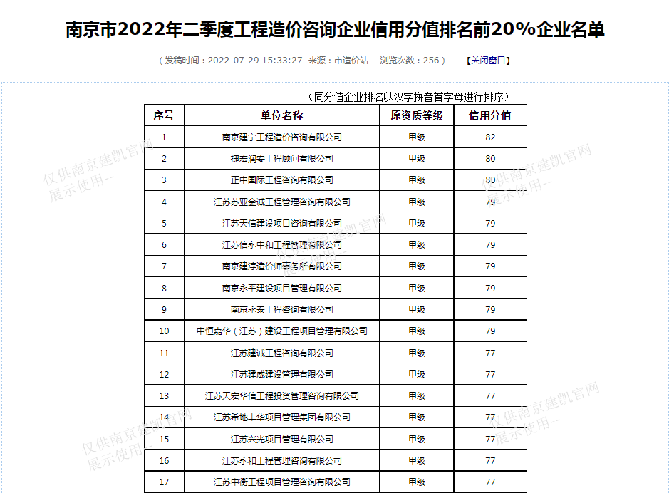 恭喜我司造价部入选“南京市2022年二季度众博官网造价咨询企业信用分值排名前20%企业名单”