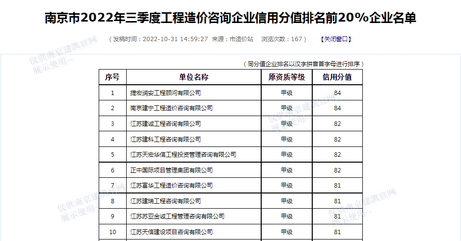 恭喜我司造价部入选“南京市2022年三季度众博官网造价咨询企业信用分值排名前20%企业名单”