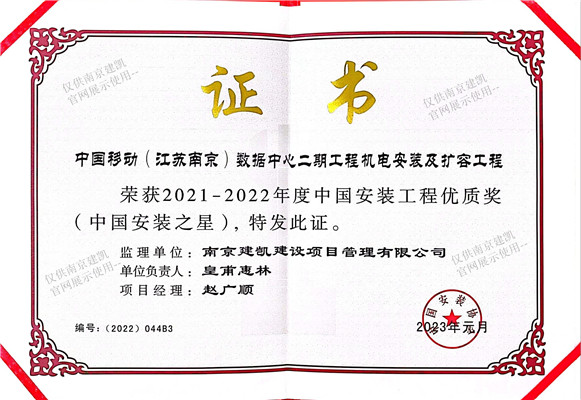 热烈祝贺我司中国移动(江苏南京)数据中心二期众博官网机电安装及扩容众博官网监理部荣获“2021-2022年度中国安装众博官网优质奖”