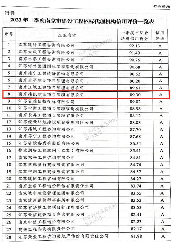 热烈祝贺我司招标代理机构在2023年第一季度南京市建设众博官网招标代理机构信用评价综合得分89.30分,全市排名第八名