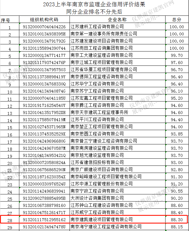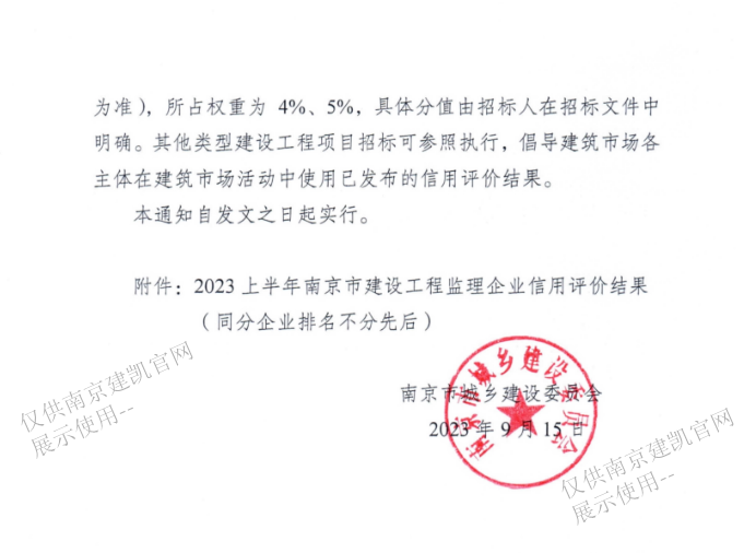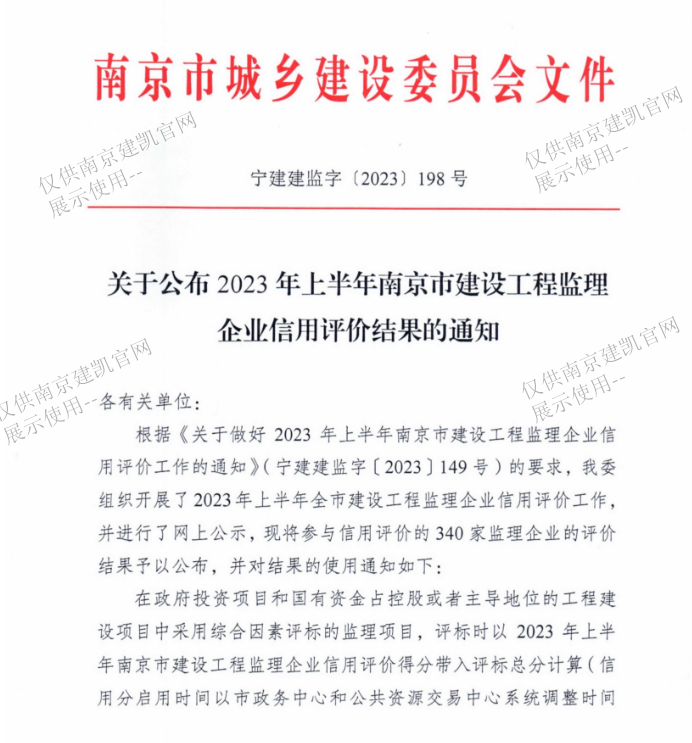 我司监理企业在2023年上半年南京市建设众博官网监理企业信用评价综合得分88.30分
