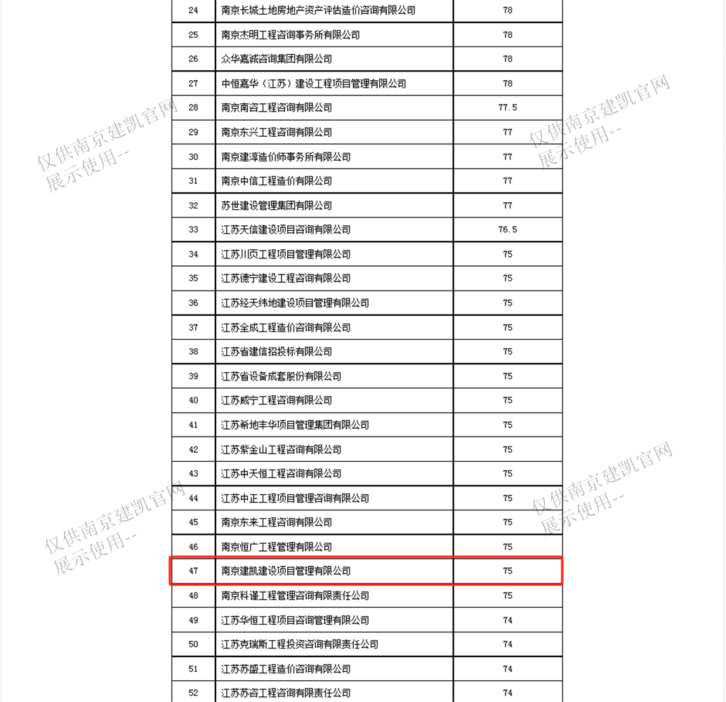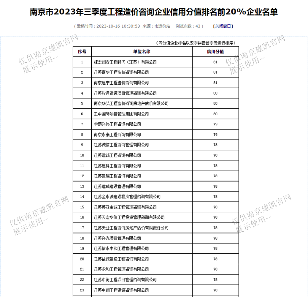 恭喜我司入选“南京市2023年三季度众博官网造价咨询企业信用分值排名前20%企业名单”