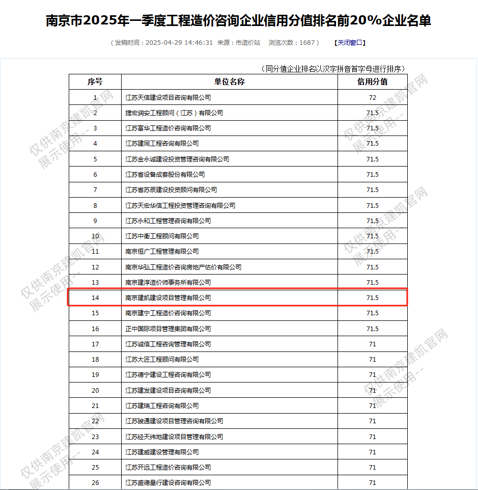 恭喜我司入选“南京市2025年一季度众博官网造价咨询企业信用分值排名前20%企业名单”