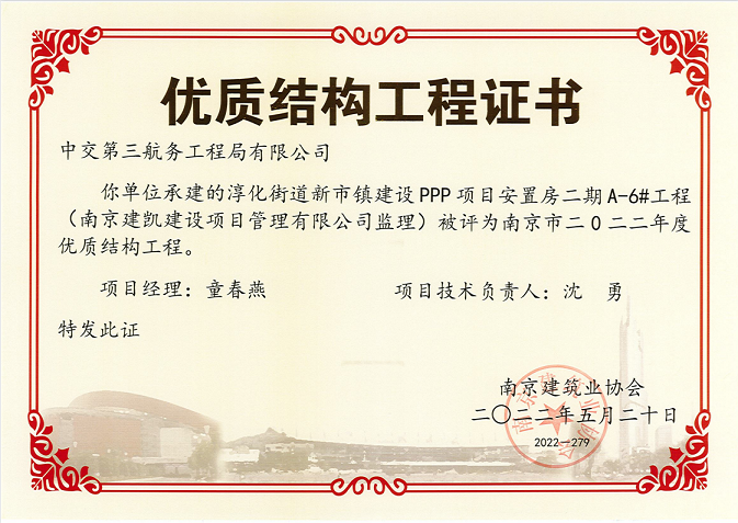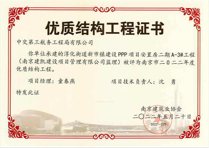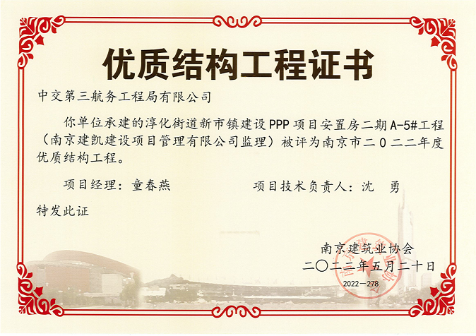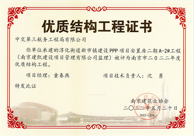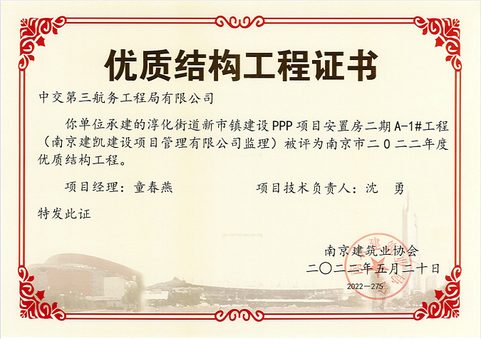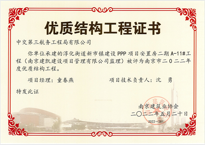 (2022年05月20日)淳化街道新市镇建设PPP项目安置房二期项目荣获《南京市2022年度优质结构众博官网》