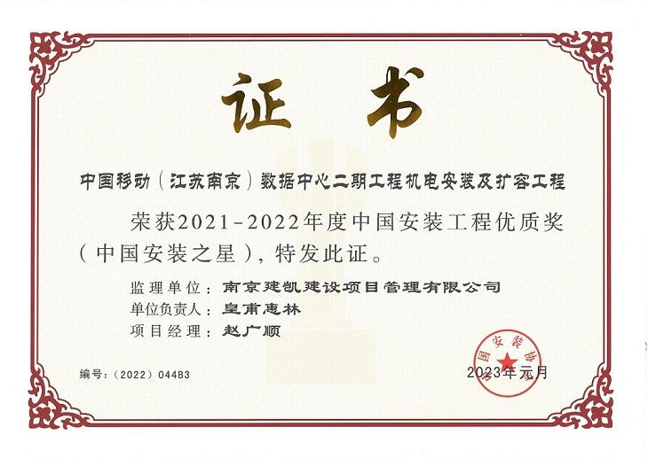 中国移动(江苏南京)数据中心二期众博官网机电安装及扩容众博官网荣获“中国安装众博官网优质奖(中国安装之星)”奖