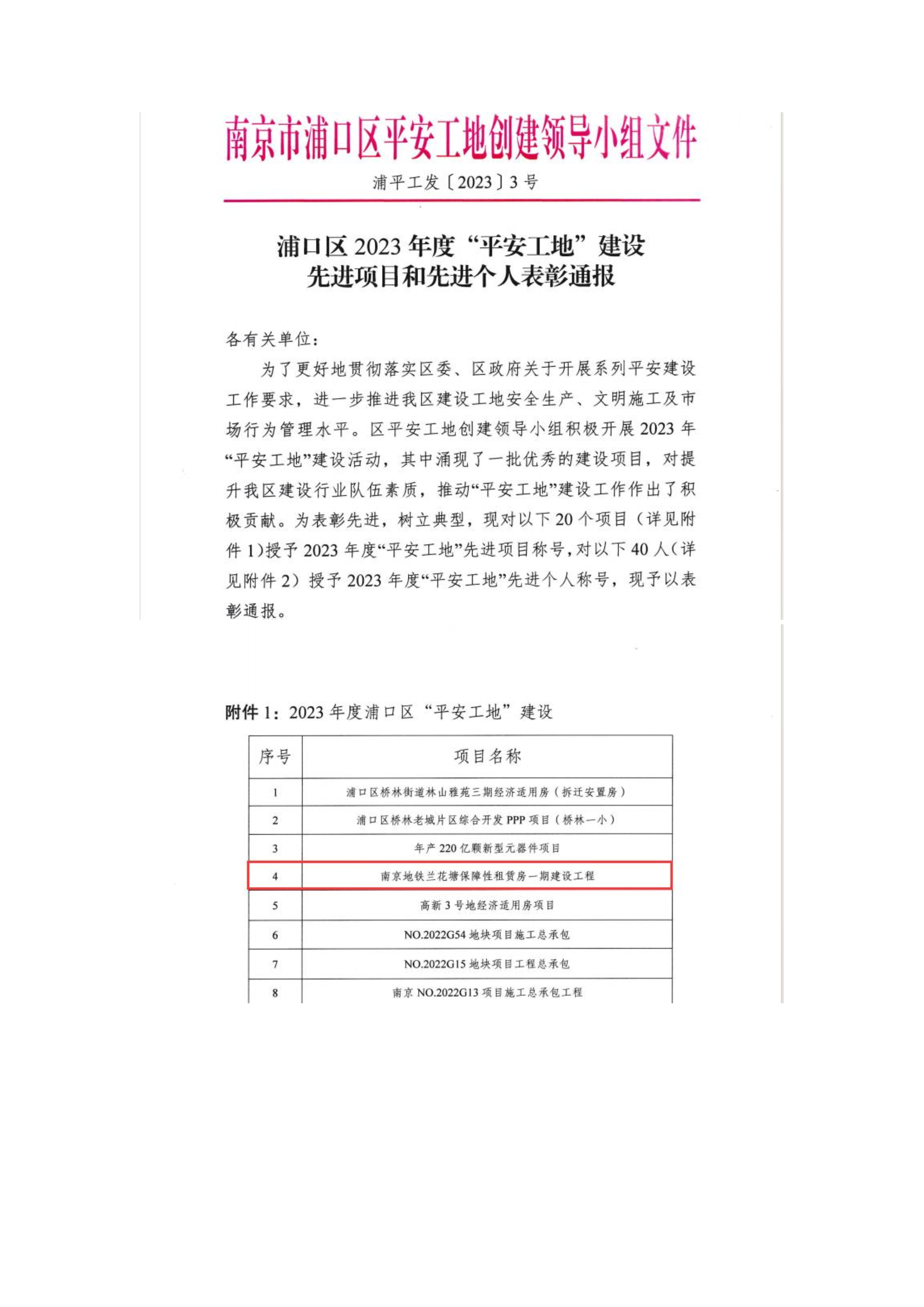 南京地铁兰花塘保障性租货房一期建设众博官网荣获“浦口区2023年度“平安工地”建设先进项目”