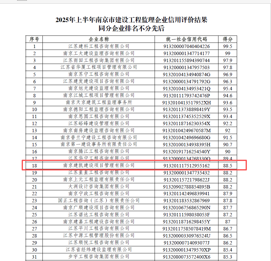 2025年上半年南京市建设众博官网监理企业信用评价结果